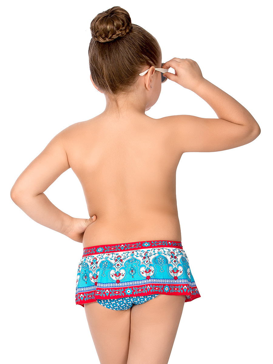 Великолепные юбка-плавки для маленьких девочек. Простая, удобная конструкция с универсальной посадкой. Плавки на контрастном отрезном поясе выполнены в модном мозаичном принте «Санторини», а юбка – в поместном багетном принте. Модель оформлена золотой подвеской.