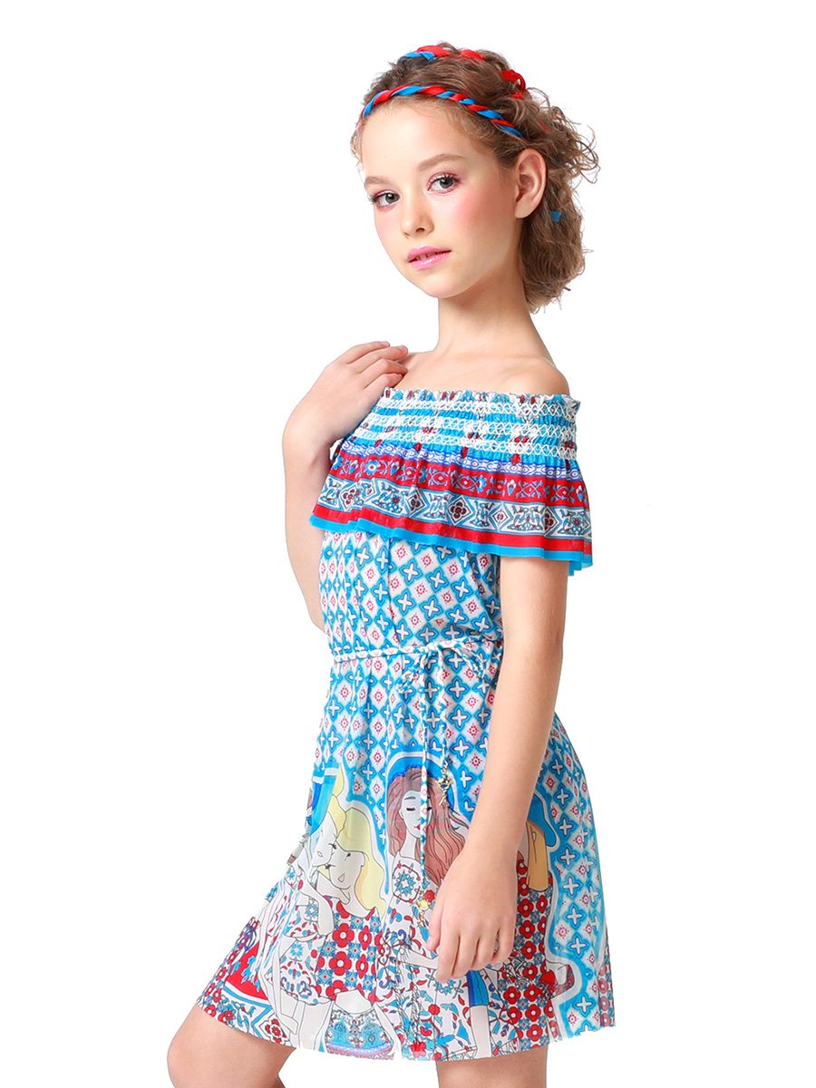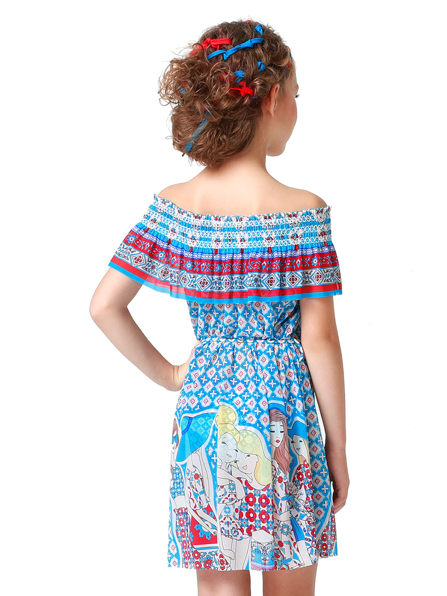 Модное пляжное платье свободного A-силуэта. Линия декольте оформлена пышной багетной оборкой, которая красиво облегает линию плеч за счет резинки гофре. Платье изготовлено из мягкой сетки в раппортном мозаичном принте «Санторини» и дополнено стильным рисунком «Модные подруги». Пояс с фирменным золотым наконечником поможет менять облик модели.