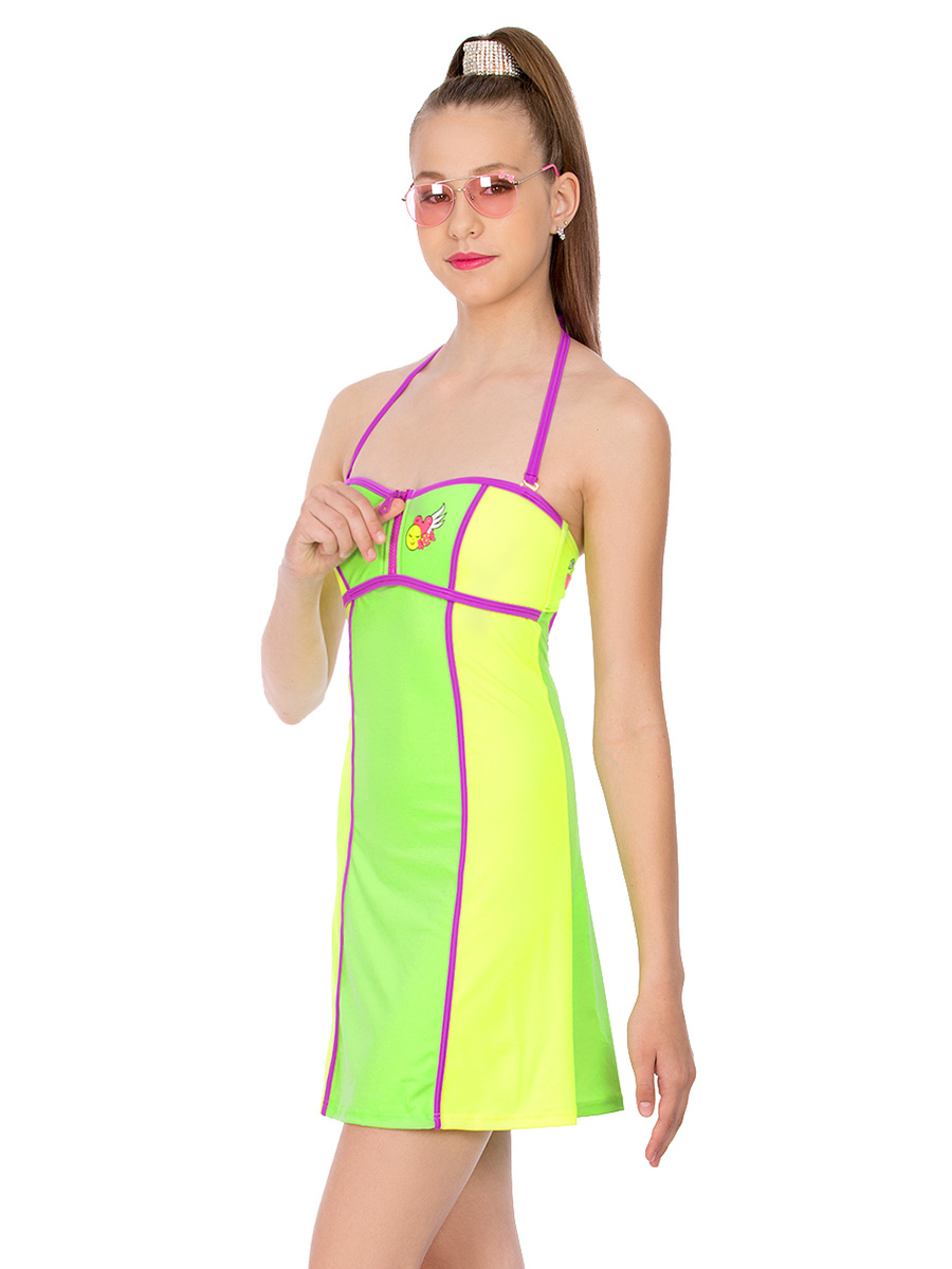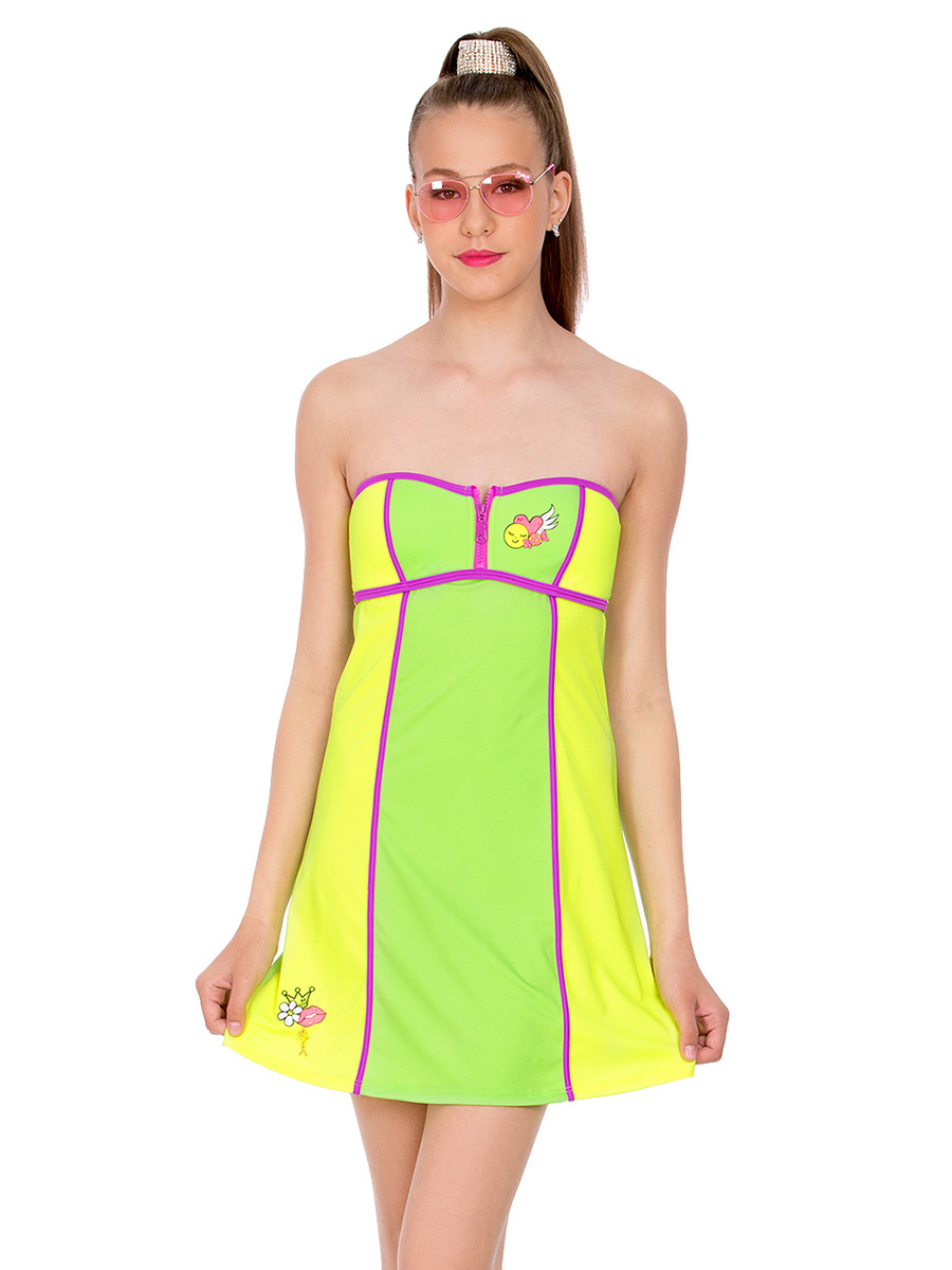 Яркое расклешенное платье с завышенной талией для пляжа и отдыха Верх – бандо с дублированными поролоновыми чашками, боковыми каркасами и пластиковой молнией по центру. Фиксируется с помощью съемных завязок и металлической застежки, образуя вырез на спине. Низ – трапециевидной формы длиной выше колен. Платье выполнено в сочетании неоновых оттенков и украшено рельефами и окантовками. Разноцветные принты «Эмодзи» в стилистике коллекции и подвеска-корона привлекают внимание и дарят неповторимый вид.