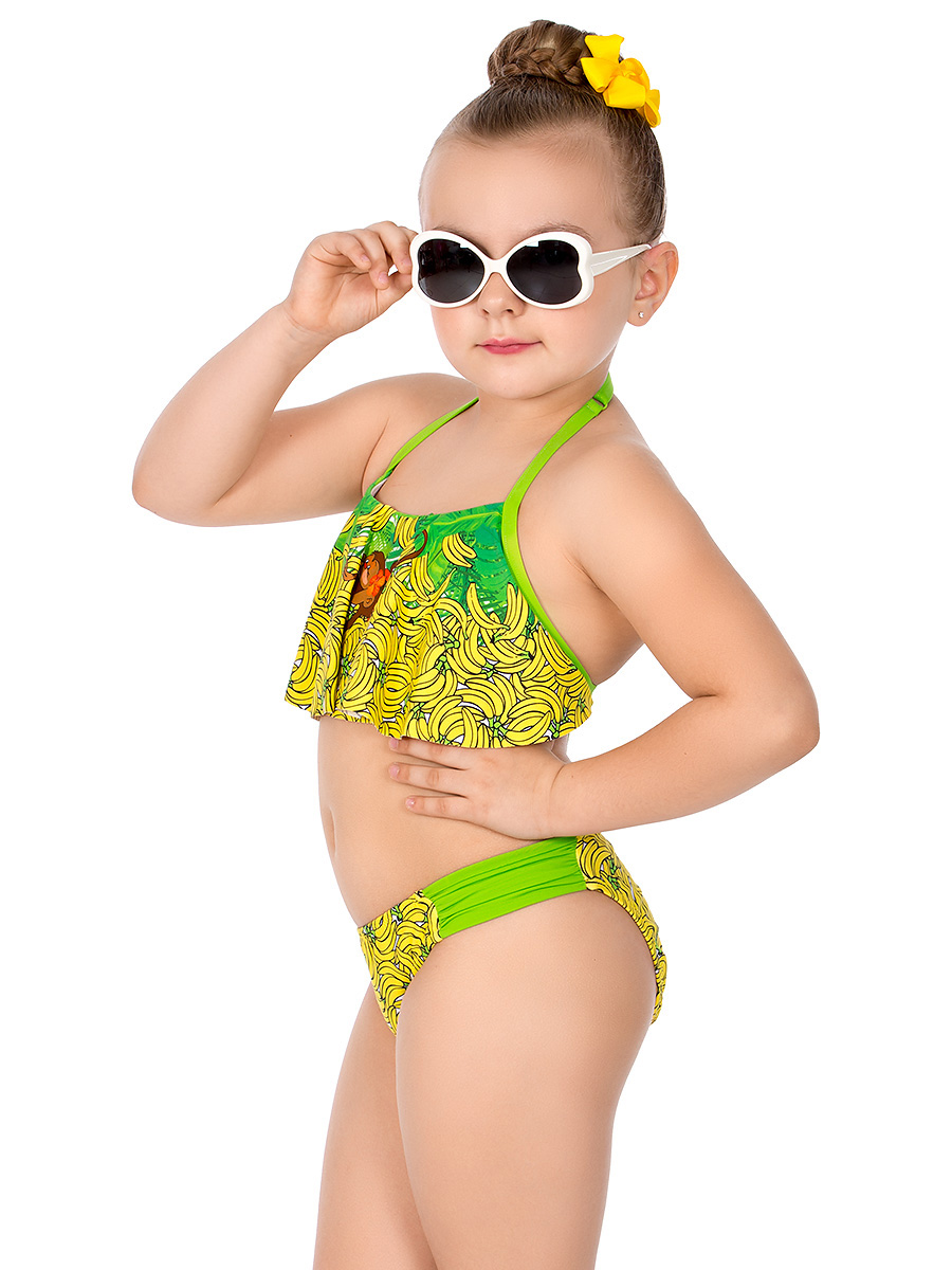 Красочный пляжный купальник для девочек разных возрастов. Бюст-топ с широкой драпировкой, ниспадающей мягкими складками, и контрастными окантовками. Фиксируется на теле при помощи регулируемой плоской бретели и завязок на спине. Яркие плавки безупречной посадки, с рельефами и контрастным отрезным боком с драпировкой. Купальник выполнен в летнем сочетании принта «Банановый рай» и сочного салатового цвета.