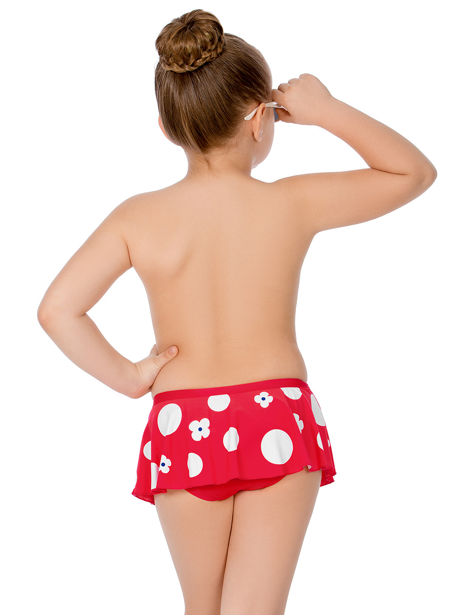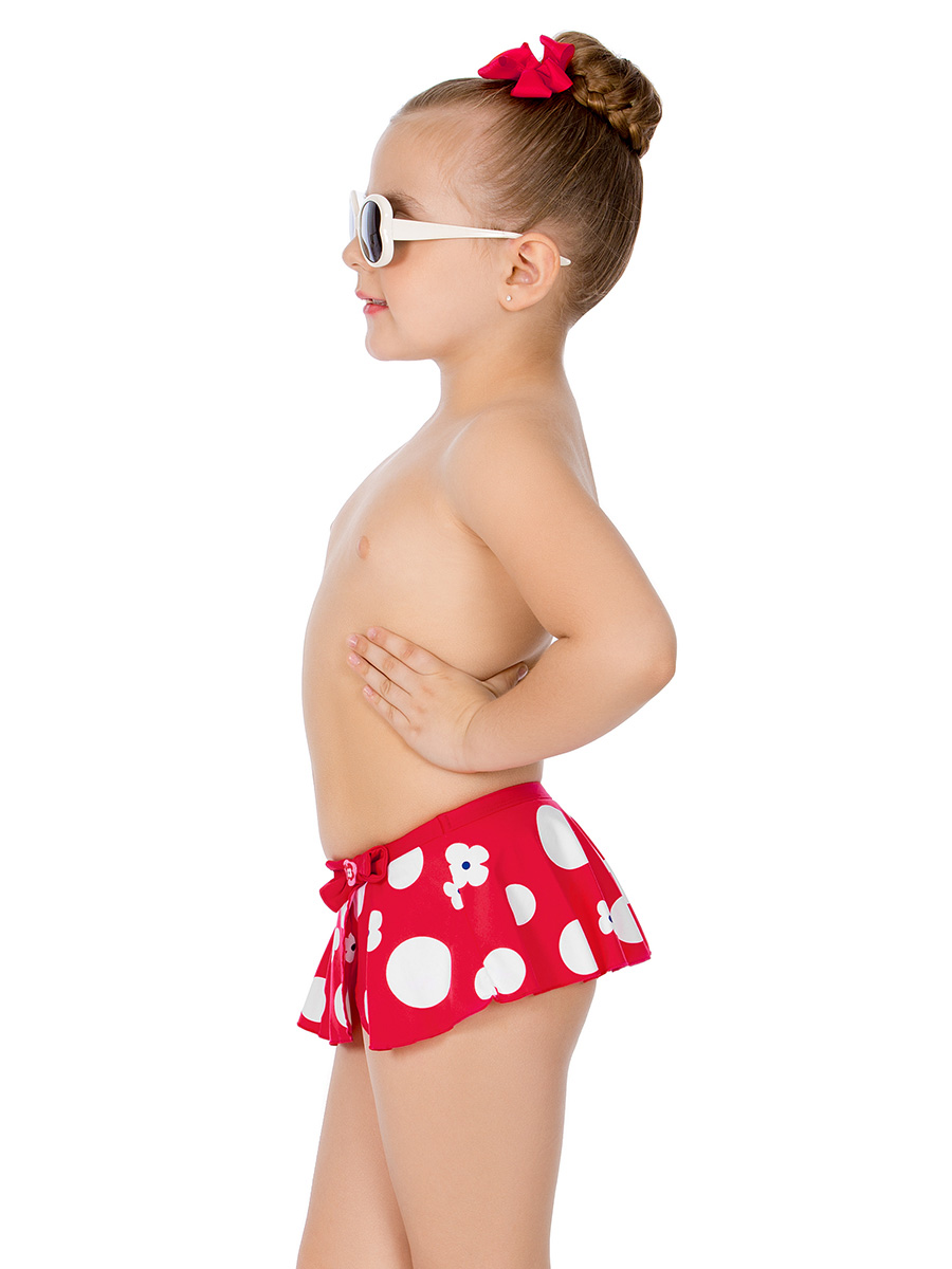 Эффектная юбка-плавки для девочек. Юбочка с запахом оформлена бантом с резиновой нашивкой-цветком. Модель комфортной посадки с широким боком выполнена в сочетании авторского принта «Божья коровка» и ярко-красного однотона.