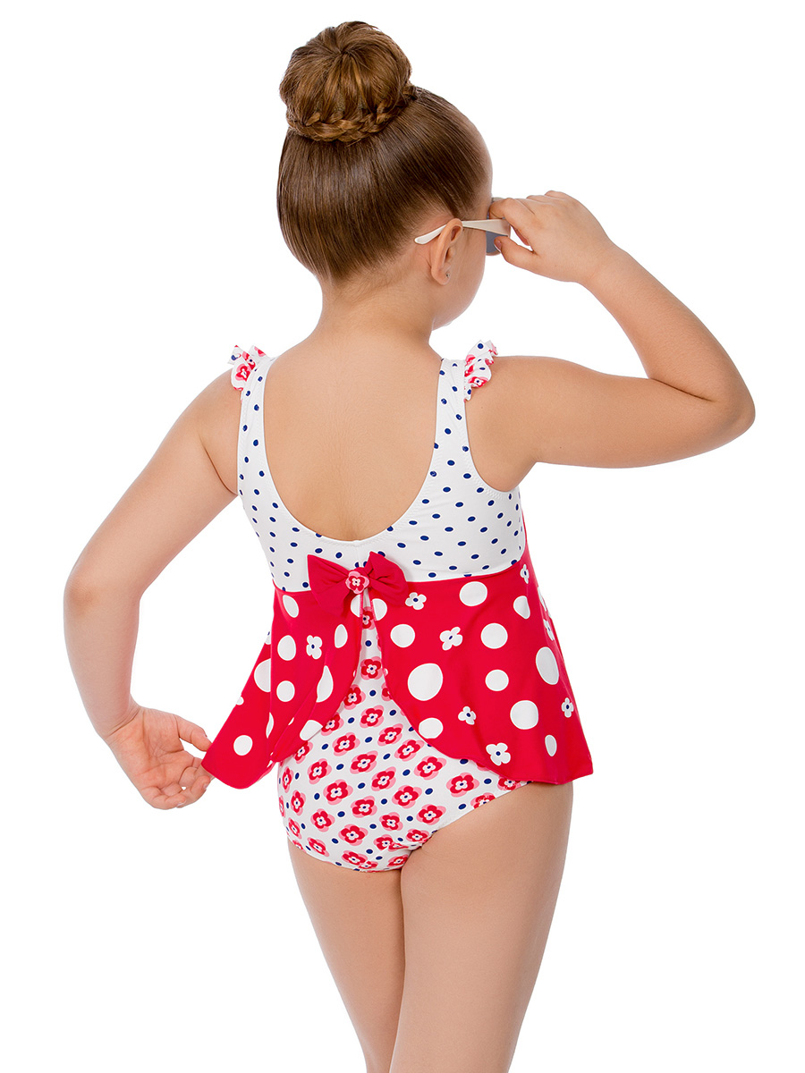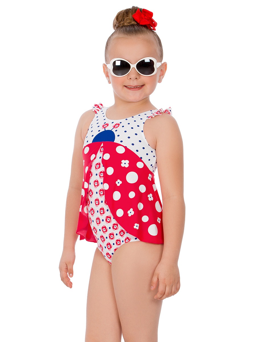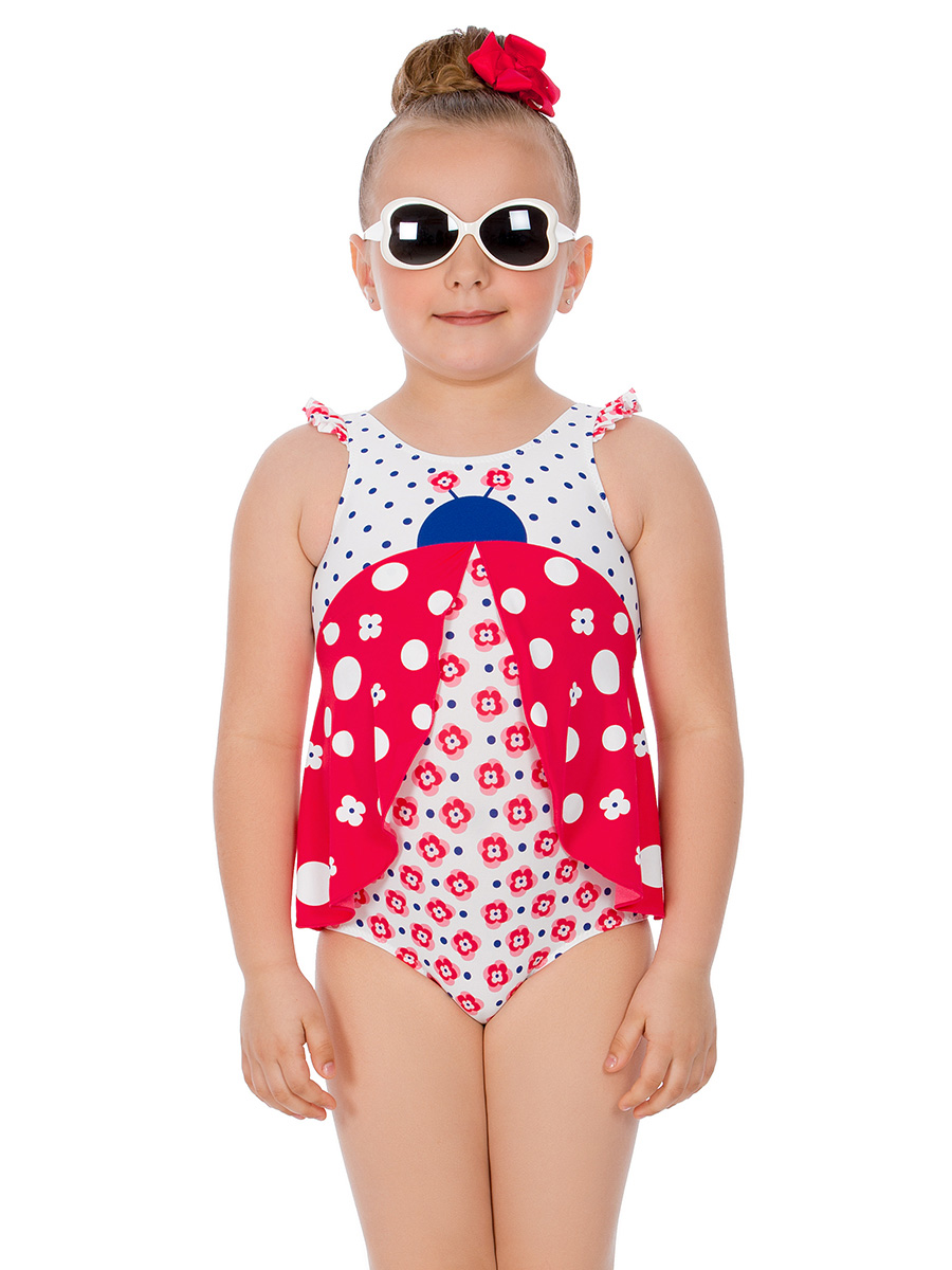 Очаровательный купальник-платье оригинального кроя. Модель с широкими бретелями с оборками и вырезом на спине оформлена слегка расклешенной юбочкой. Купальник выполнен из матовой микрофибры в эффектной комбинации модных летних принтов-компаньонов. Переднюю деталь украшает крупный рисунок «Бюжья коровка», а заднюю – кокетливый бантик с резиновой нашивкой-цветком.