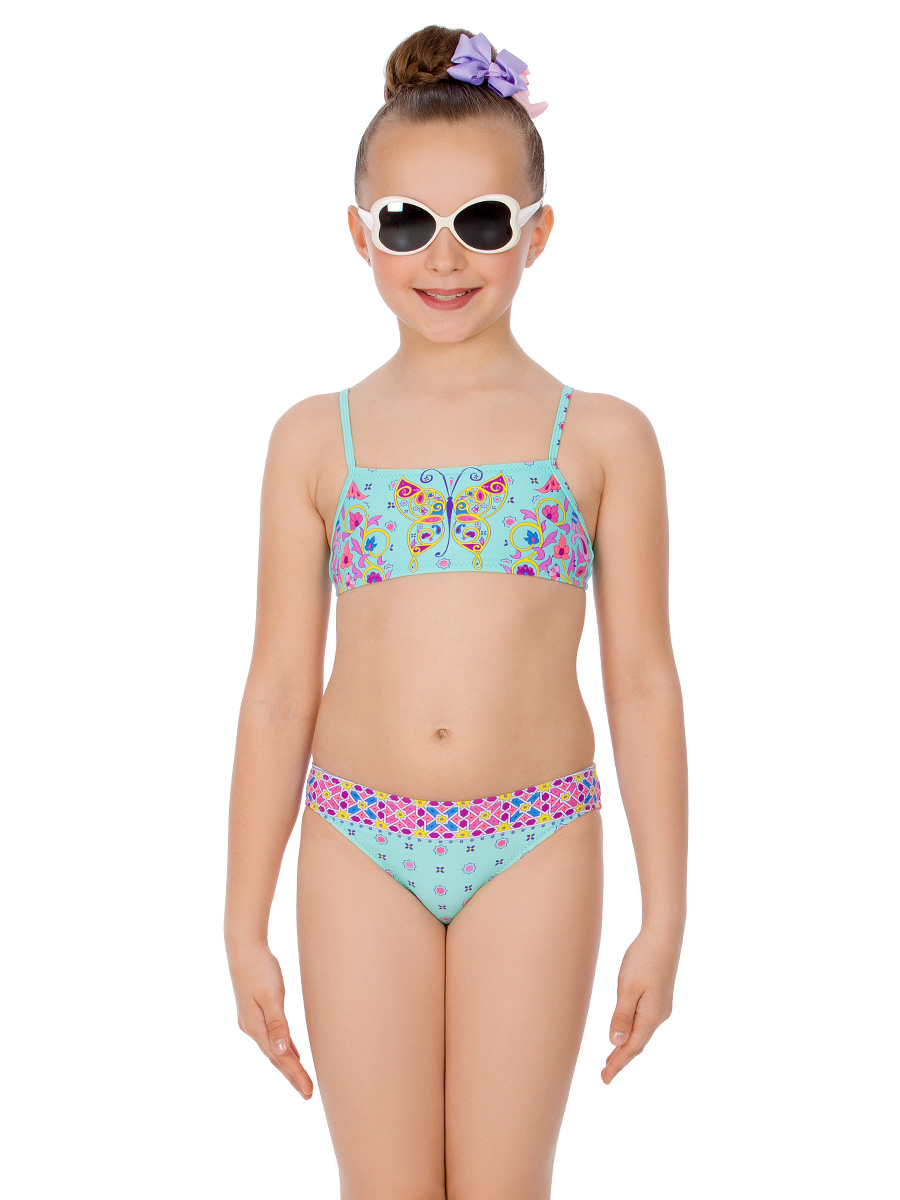Удобный пляжный ансамбль из двух предметов. Классический бюст-топ на тонких регулируемых бретелях фиксируется пластиковой застёжкой на спине. Разноцветная графическая бабочка дарит купальнику летнее настроение. Плавки комфортной посадки с широким боком по поясу декорированы багетом.