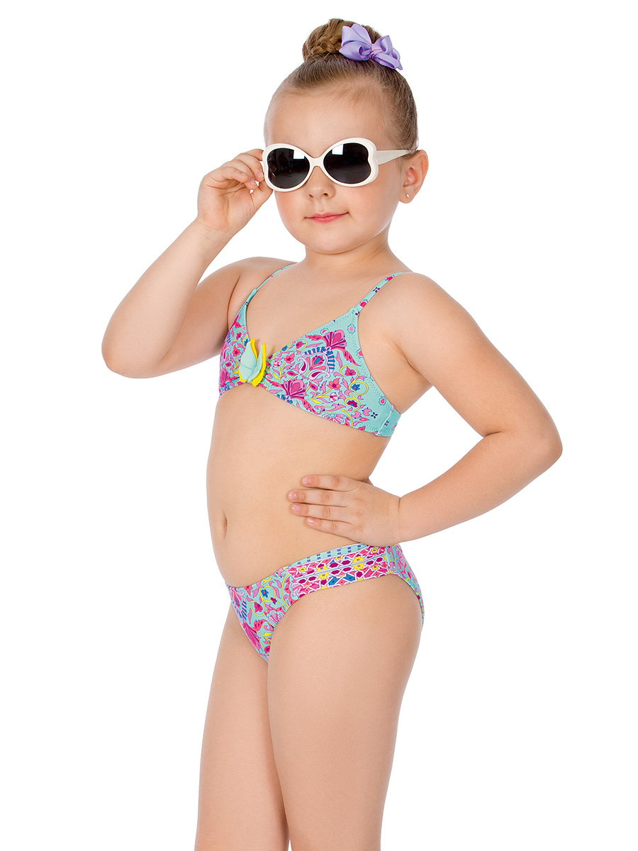 Стильный купальник из двух предметов. Бюст треугольной формы с мягкими чашками фиксируется отстегивающимися регулируемыми бретелями и пластиковой застежкой на спине. По центру бюст украшен бабочкой-паф. Стильные плавки классической посадки, с рельефами и отрезными бочками с драпировкой.