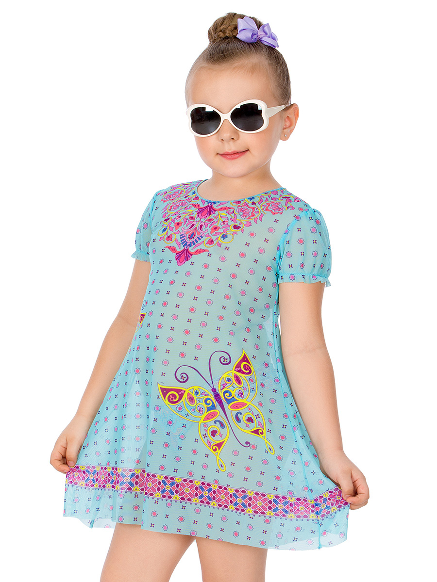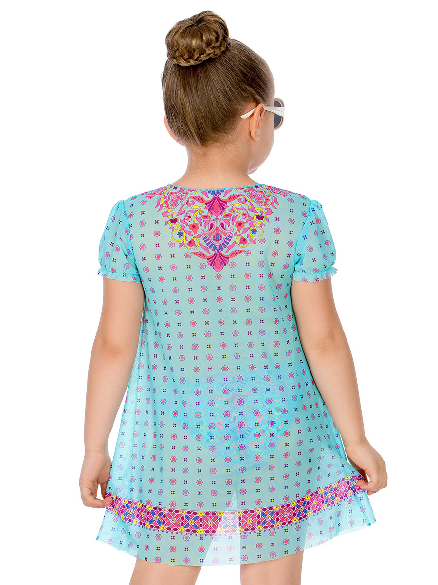 Очаровательное пляжное платье для девочек. Модель свободного расклешенного A-силуэта с круглым вырезом и рукавами-фонариками. Изделие выполнено в витражной стилистике мозаичных и графических принтов и узоров на нежно-голубом фоне, а яркие бабочки дарят образу летнее настроение!