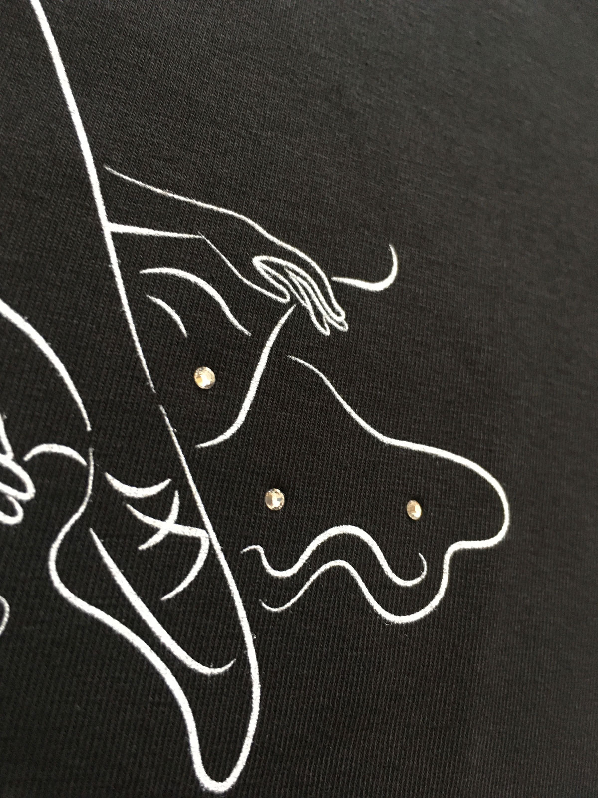 Спортивная чёрная футболка приталенного фасона для девочек. Футболка лёгкая, облегающая, декорированная тематическим принтом "балерина" и стразами ювелирного блеска. Изготовлена из высококачественного хлопкового полотна с небольшим добавлением эластана. Предназначена как для регулярного использования на занятиях по физической подготовке в хореографическом зале, так и для повседневной носки. Перед первым использованием футболка нуждается в стирке. Гладить следует с изнаночной стороны.