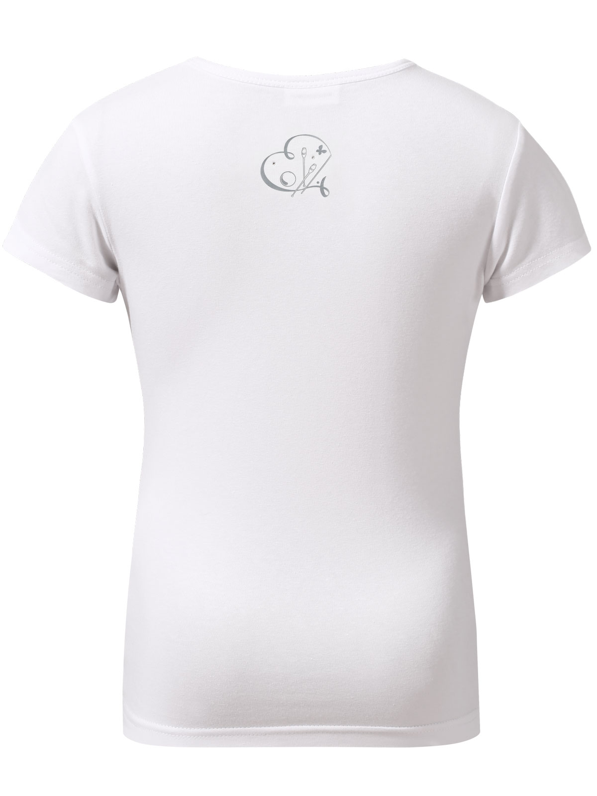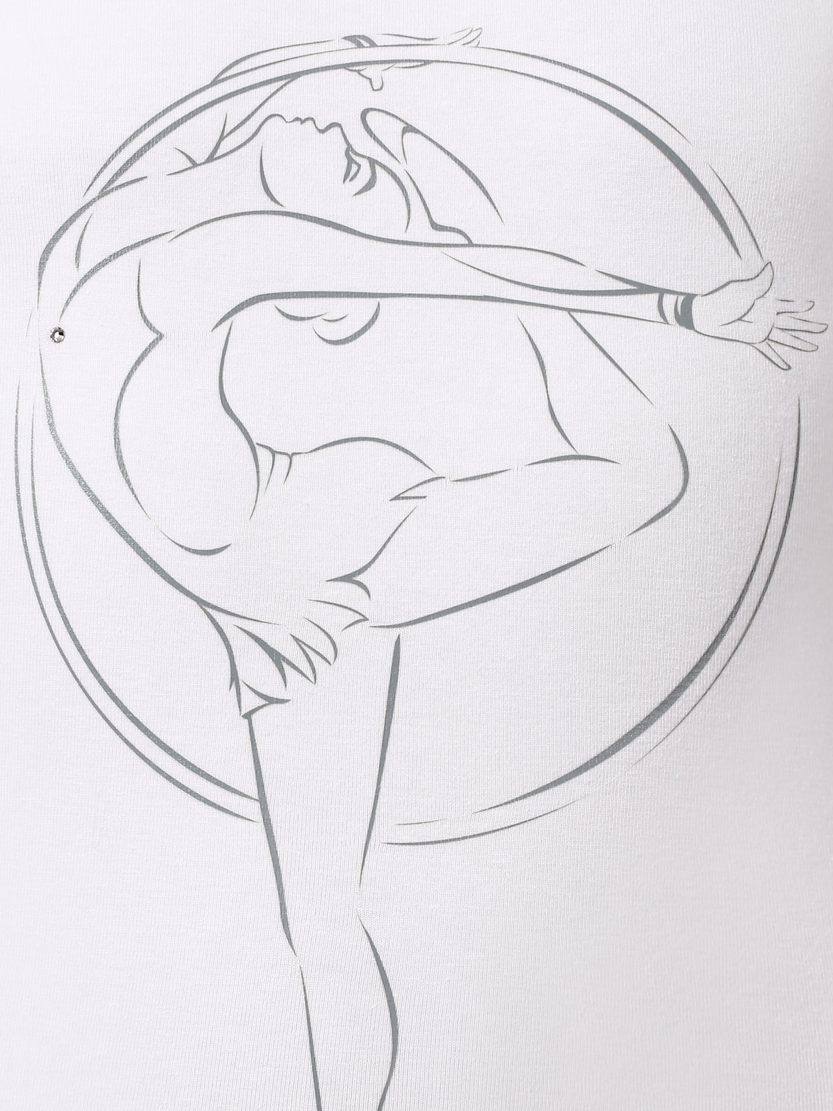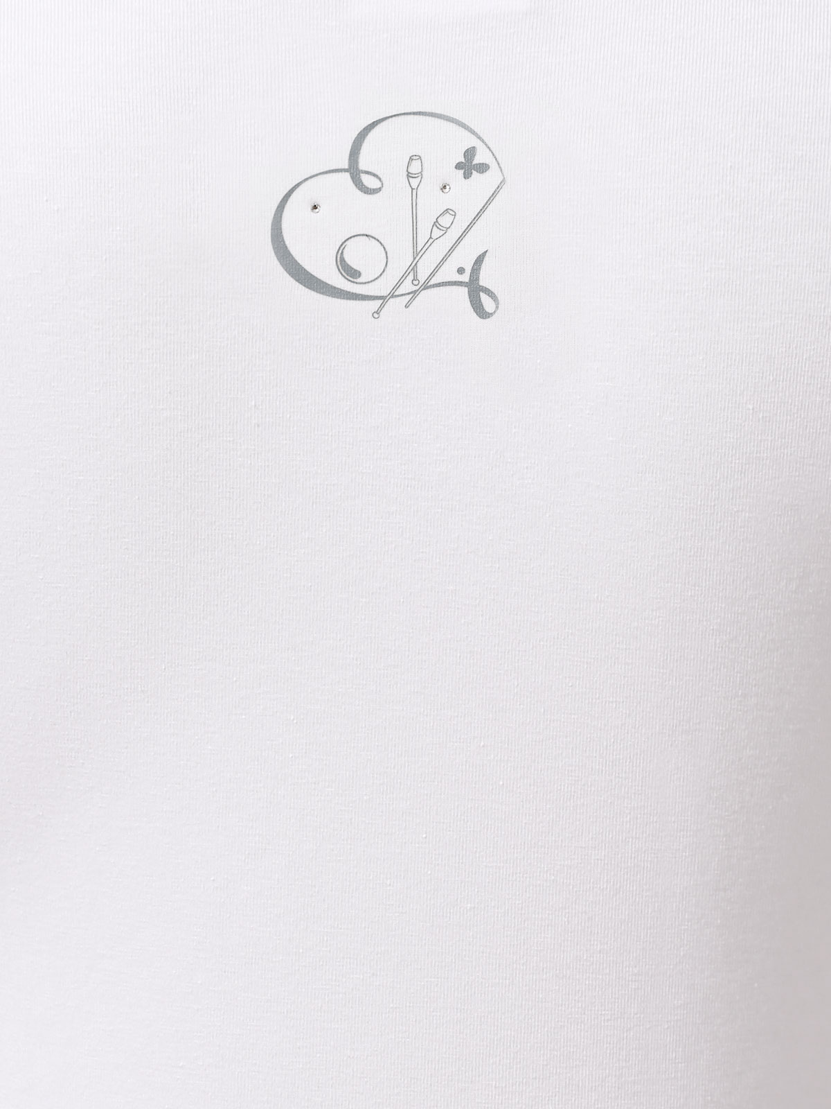 Белая спортивная футболка приталенного фасона для девочек. Футболка лёгкая, облегающая, декорированная тематическим принтом "художественная гимнастика" и стразами ювелирного блеска. Изготовлена из высококачественного хлопкового полотна с небольшим добавлением эластана. Предназначена как для регулярного использования на занятиях по физической подготовке в зале, так и для повседневной носки.