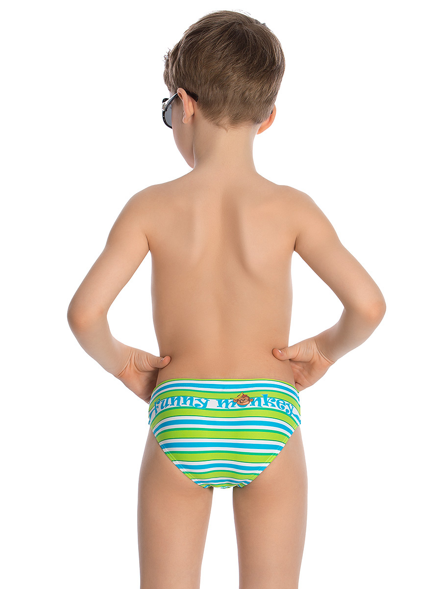 Классические плавки для мальчиков младшего возраста. Удобная модель комфортной посадки с поясом запакованного типа и потайным шнуром - для регулировки объема. Передняя деталь оформлена принтом смешной обезьянки, а задняя – надписью «Funny monkey», что в сочетании с летней полоской обеспечивает изделию великолепный вид.