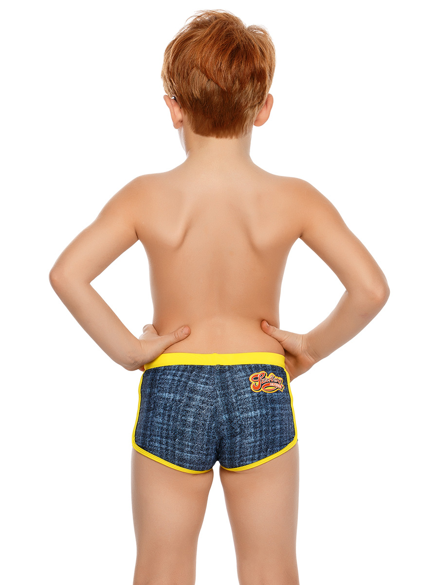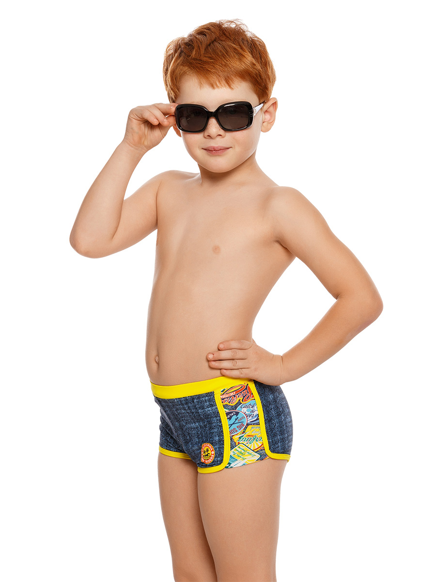 Оригинальные пляжные плавки-шорты для мальчиков с отрезным поясом запакованного типа и потайным шнуром - для регулировки объема. Модель комфортной посадки выполнена из микрофибры «под деним» с широкими боковыми вставками. Широкие конструкторские окантовки с нижних краев переходят на боковые детали, обрамляя вставки
